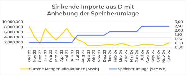 Trotz der angekündigten Abschaffung ändert sich leider nichts an der Tatsache, dass seit Einführung der Umlage viele Millionen EU-rechtswidrig, in den letzten Monaten nach D geflossen sind bzw. die Gasspeicherumlage ihre Wirkung als effizientes Handelshemmnis entfaltet hat. Importe aus Deutschland sind 2024 abermals deutlich gesunken, 2022 lagen sie bei 75 TWh, 2023 bei 30 und 2024 bislang nur bei 4,5 TWh, also nur noch 6 % im Vergleich zu 2022.