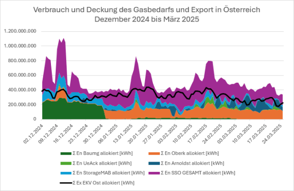 Die Diversifizierung der Lieferrouten kann man in der Grafik deutlich erkennen, jedoch ist die Deckung des Bedarfs und die Exportmengen sehr stark von Speicherentnahmen abhängig. (Anmerkung: Die Fläche über der schwarzen Linie zeigt die Exportmengen und gegen Ende März in geringen Maßen auch die Einspeicherung an.)